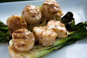 Grilled Scallops with Yuzu Kosho Vinaigrette and Steamed Mushroom Rice